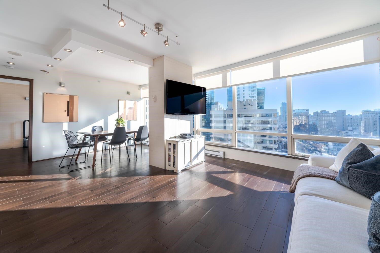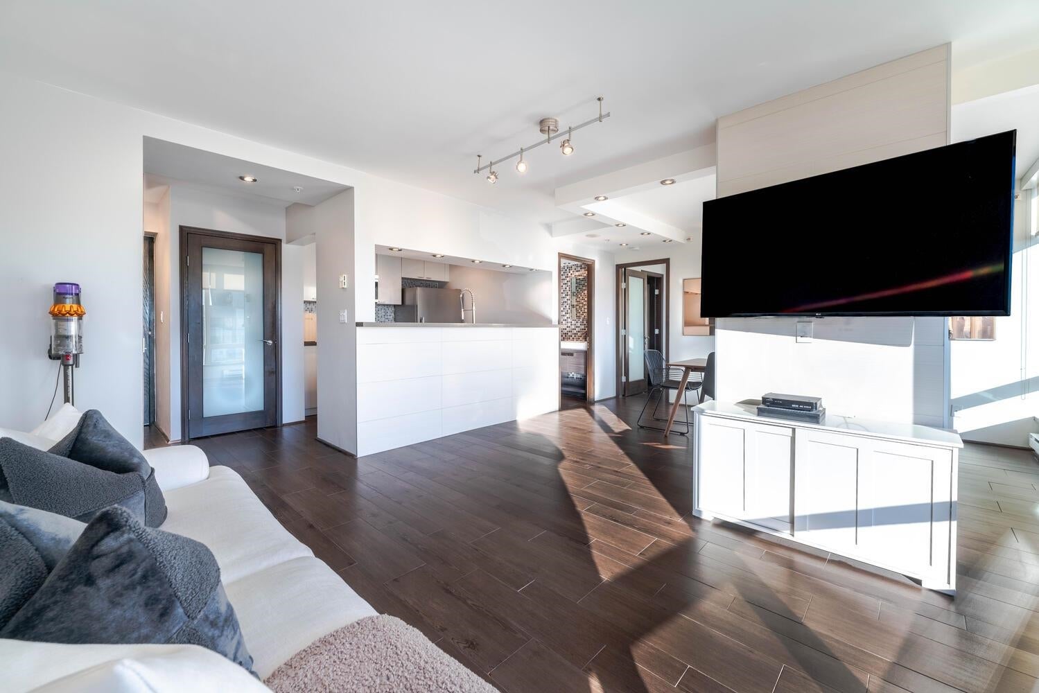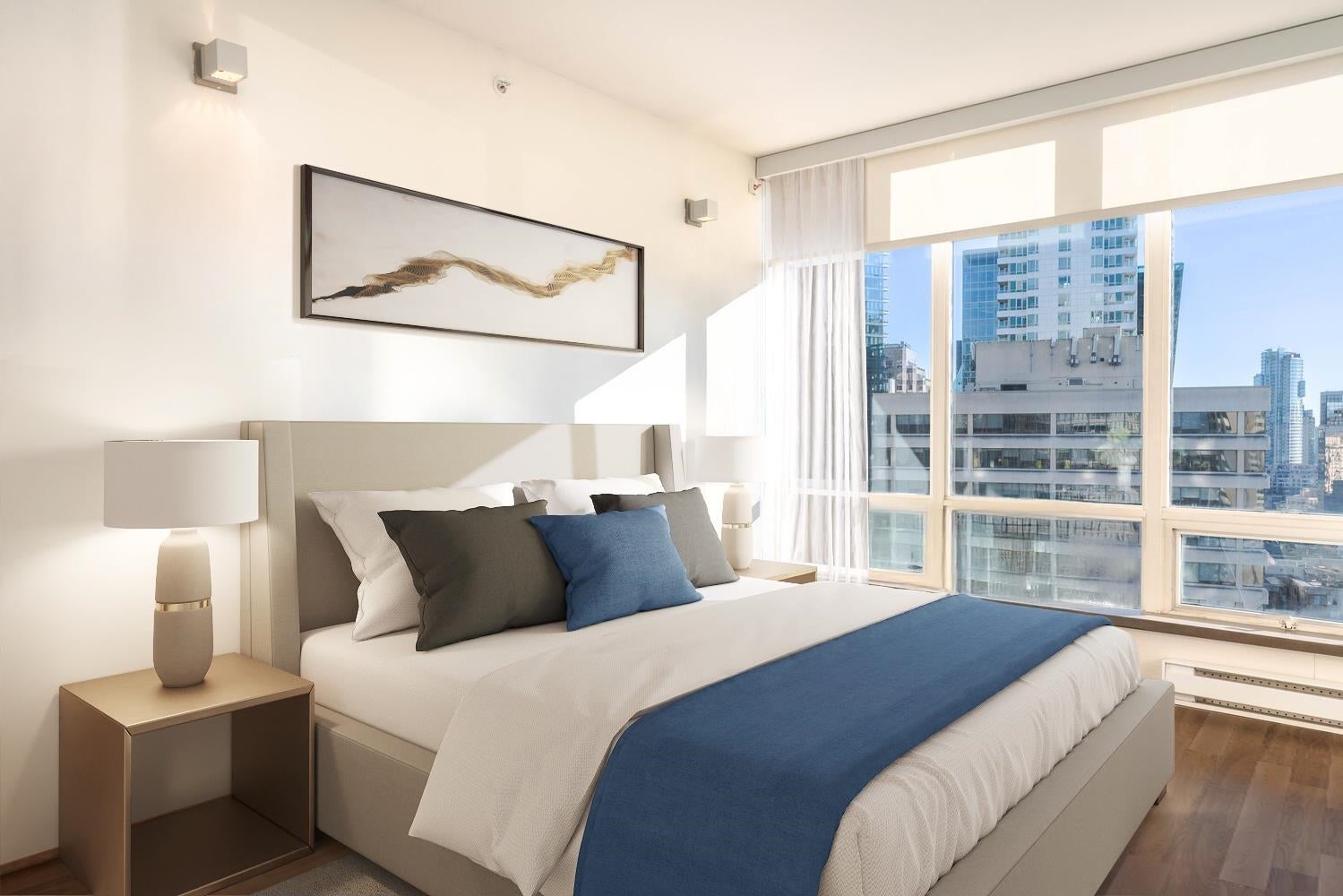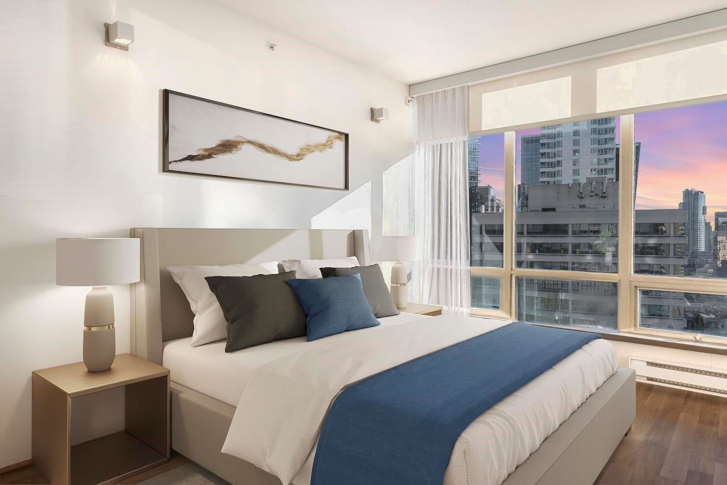 GORGEOUS SKY HOME! COVETED LOCATION! Welcome to PRESTIGIOUS "PALISADES" by James Cheng. This spacious 770 sq ft, 1 king-size bdrm + 2 full bath home (the previous owner opened up the 2nd bdrm to create a large, flexible living space) has been elegantly updated & offers the best in city living. Enjoy BIG Southeast views of the city & Robson St, quality finishes incl; BOSCH stainless steel appliances + durable wood-looking ceramic floor tiles + composite counter tops + quality, custom millwork + elegantly tiled feature walls, to create a warm & luxurious living environment. PLUS 1 parking stall & 1 storage locker. AMAZING LOCATION: Steps to transit, Robson Street, Alberni's luxury boutiques, food stores, restaurants and more! Max 2 pets permitted. Rentals: min. 30 days req.