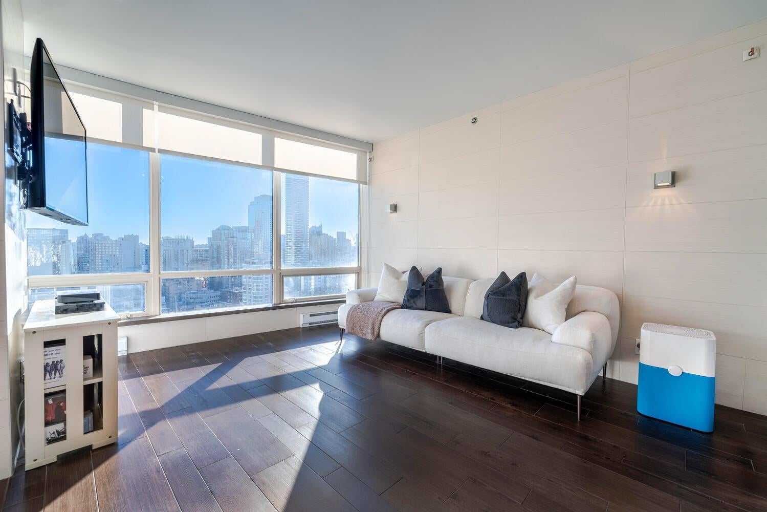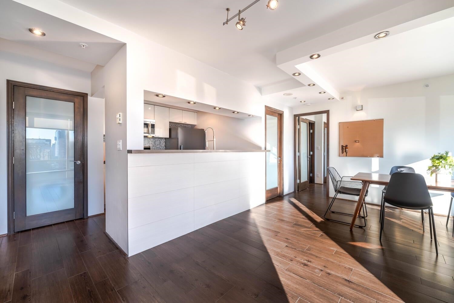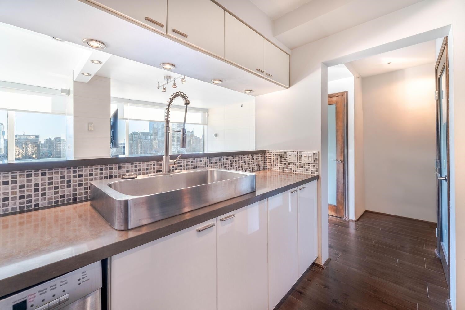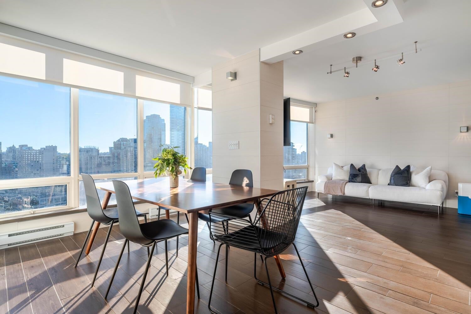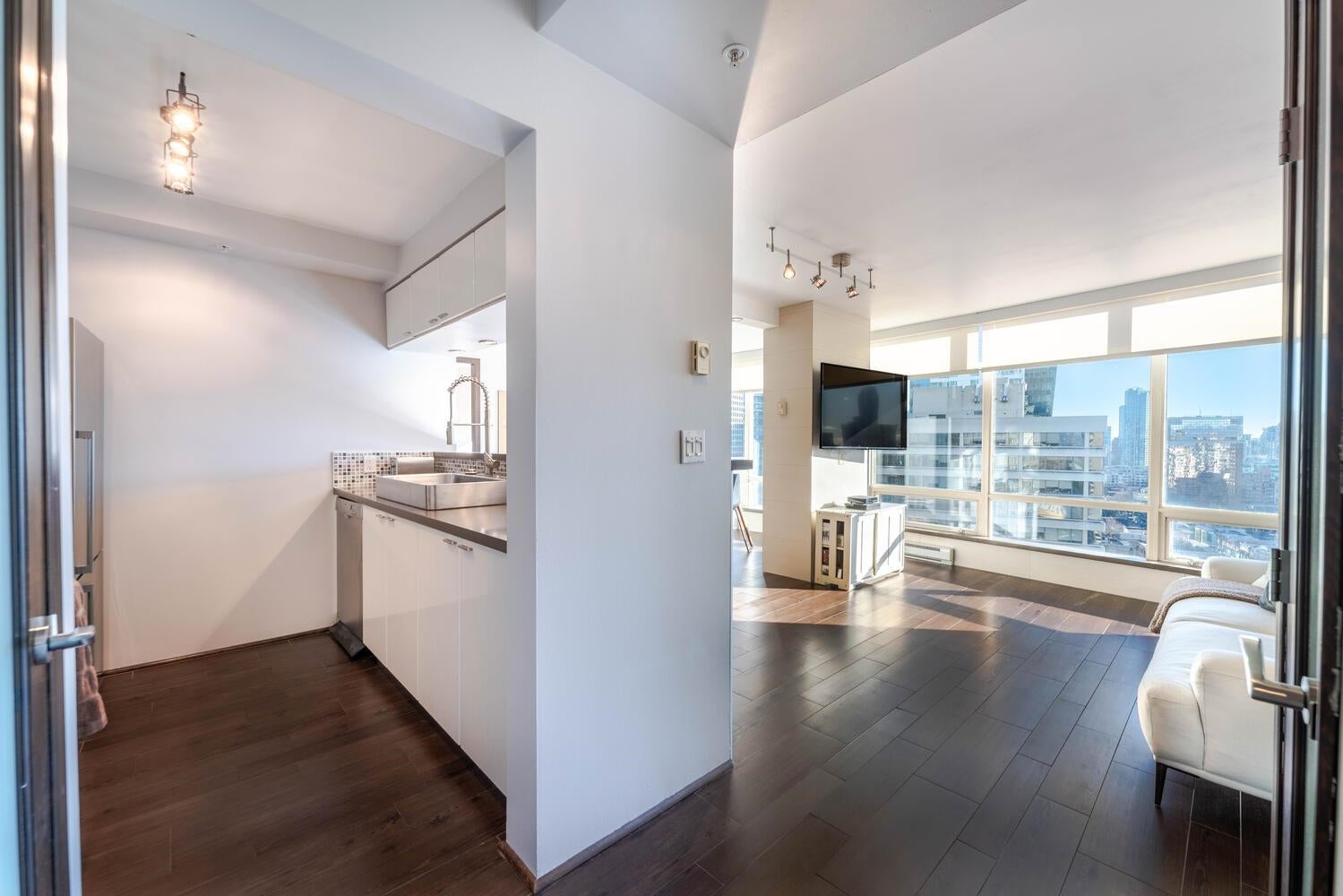 GORGEOUS SKY HOME! COVETED LOCATION! Welcome to PRESTIGIOUS "PALISADES" by James Cheng. This spacious 770 sq ft, 1 king-size bdrm + 2 full bath home (the previous owner opened up the 2nd bdrm to create a large, flexible living space) has been elegantly updated & offers the best in city living. Enjoy BIG Southeast views of the city & Robson St, quality finishes incl; BOSCH stainless steel appliances + durable wood-looking ceramic floor tiles + composite counter tops + quality, custom millwork + elegantly tiled feature walls, to create a warm & luxurious living environment. PLUS 1 parking stall & 1 storage locker. AMAZING LOCATION: Steps to transit, Robson Street, Alberni's luxury boutiques, food stores, restaurants and more! Max 2 pets permitted. Rentals: min. 30 days req.