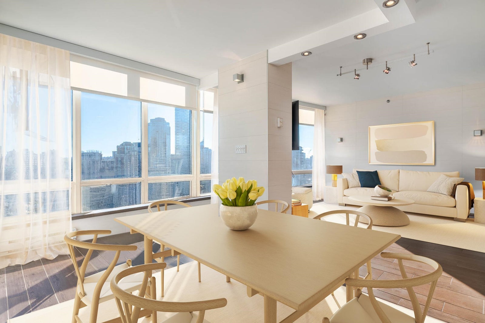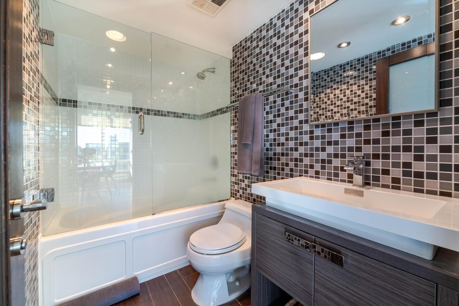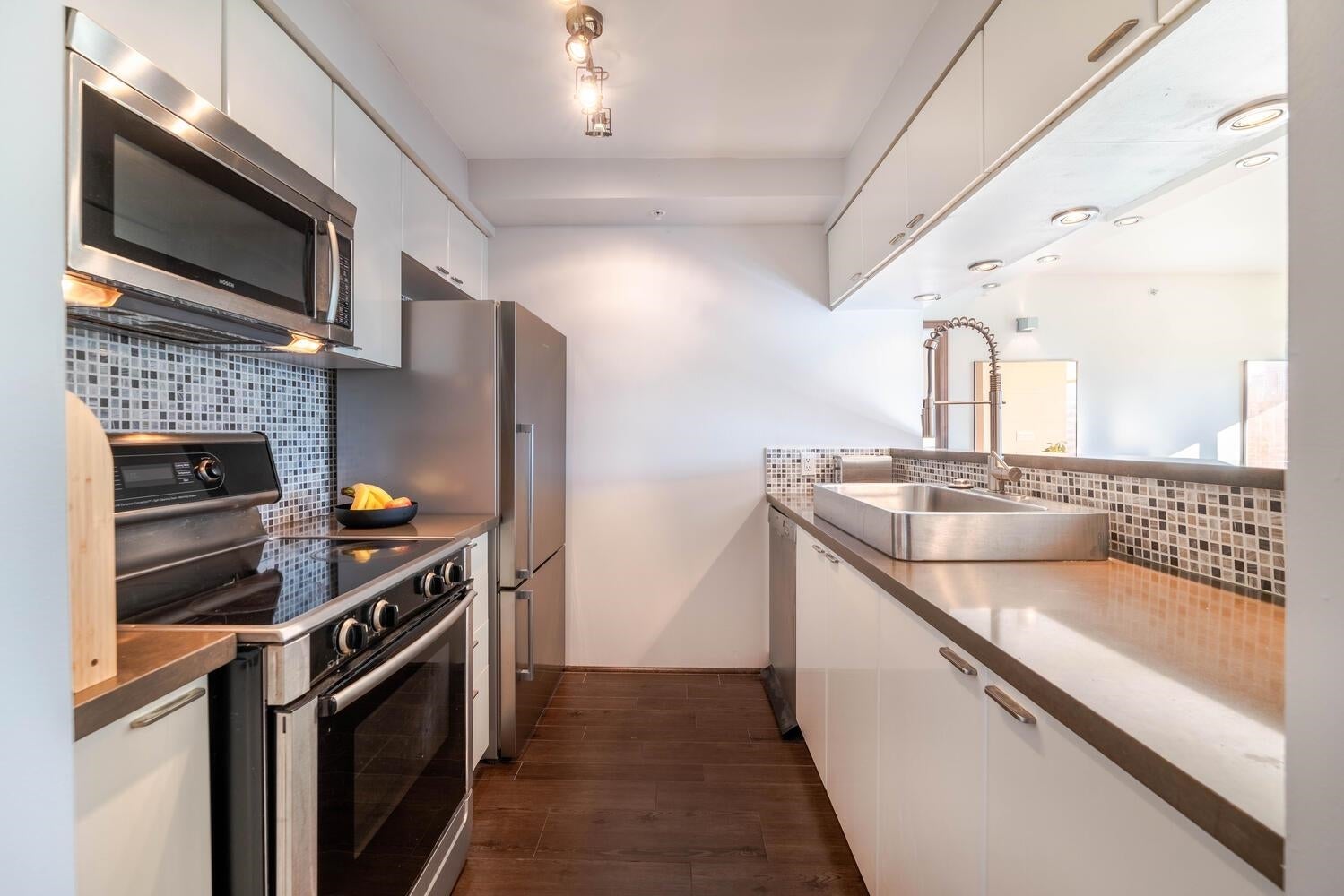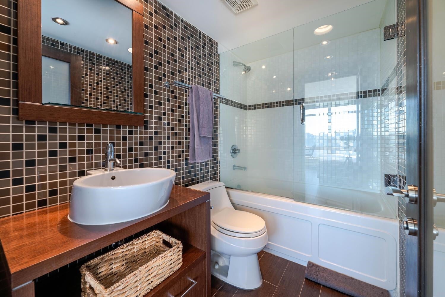 GORGEOUS SKY HOME! COVETED LOCATION! Welcome to PRESTIGIOUS "PALISADES" by James Cheng. This spacious 770 sq ft, 1 king-size bdrm + 2 full bath home (the previous owner opened up the 2nd bdrm to create a large, flexible living space) has been elegantly updated & offers the best in city living. Enjoy BIG Southeast views of the city & Robson St, quality finishes incl; BOSCH stainless steel appliances + durable wood-looking ceramic floor tiles + composite counter tops + quality, custom millwork + elegantly tiled feature walls, to create a warm & luxurious living environment. PLUS 1 parking stall & 1 storage locker. AMAZING LOCATION: Steps to transit, Robson Street, Alberni's luxury boutiques, food stores, restaurants and more! Max 2 pets permitted. Rentals: min. 30 days req.