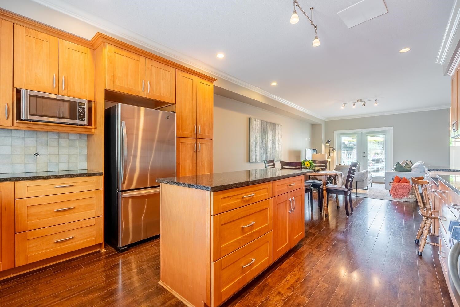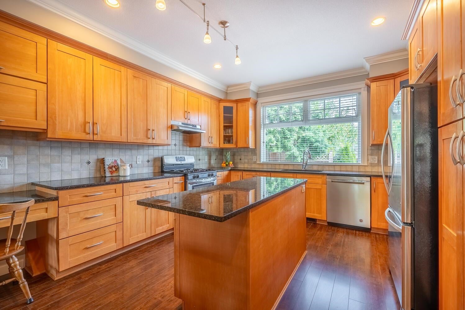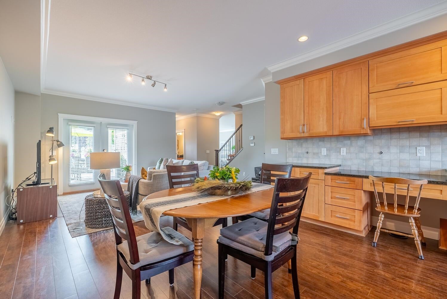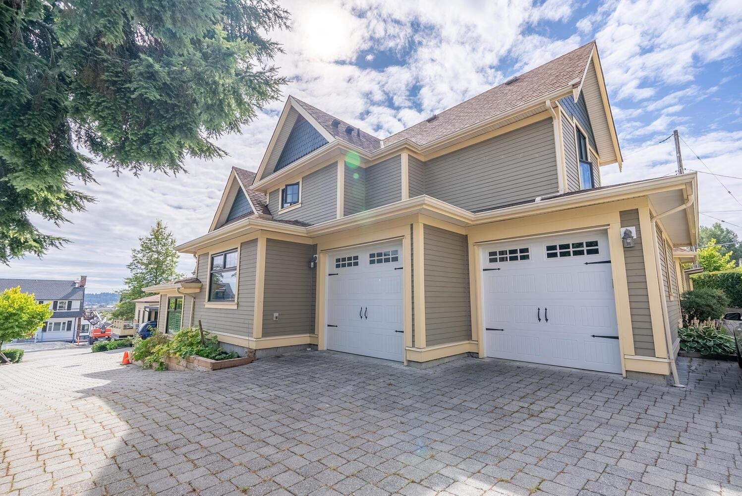 PEEK-A-BOO Fraser River Views from this stunning 3 bdrm, 4 bath, end unit, family home with vaulted ceilings & over 3009 sq. ft.! A well built, 8 unit, newer, Heritage Style Townhome is part of the revered, Bedard House Heritage complex in a sought after area! Features inc. enormous, well appointed kitchen, shaker cabinets with pull out pantries, island, eating area, cozy family room leading to an inviting patio/deck, partly covered -year-round BBQ, living room with vaulted ceilings & fp leading to a charming patio/deck, adjacent, formal, dining room is steps to the family/kitchen area; all bdrms up have vaulted ceilings, primary with ensuite & private balcony, down media room, office or games room & oversized rec room. Storage galore! An amazing opportunity! Open Sat 2-4 pm or by appt.