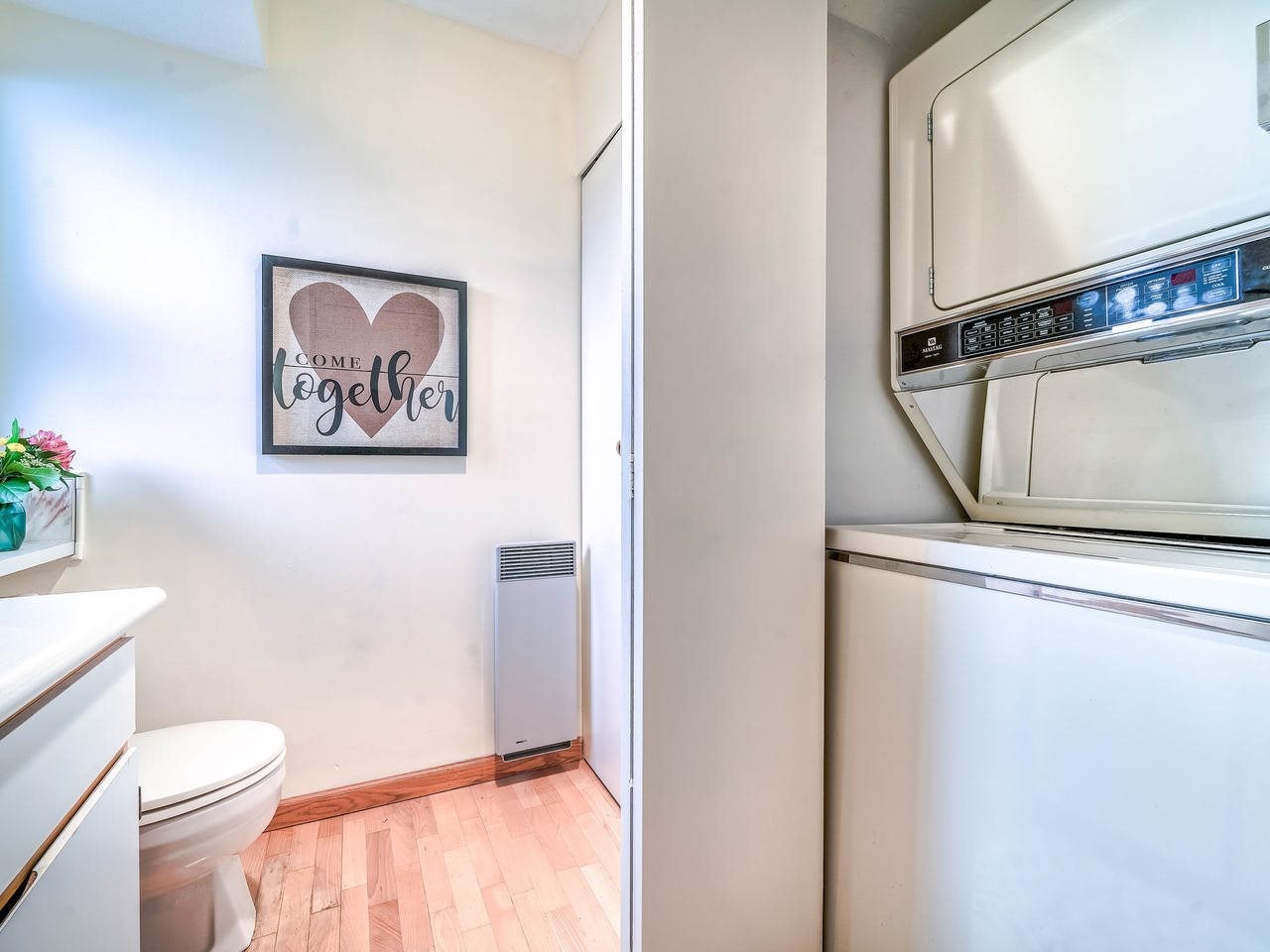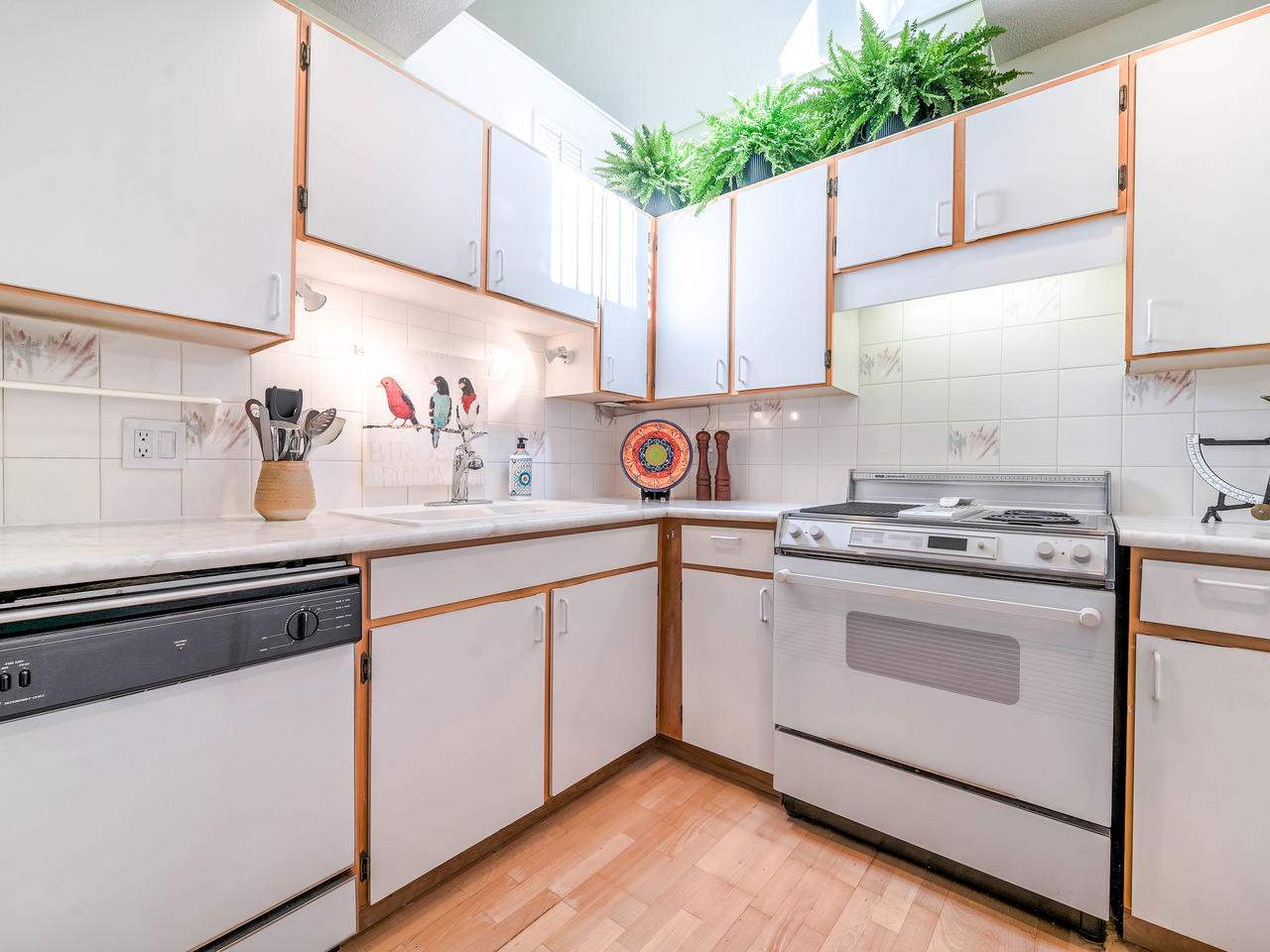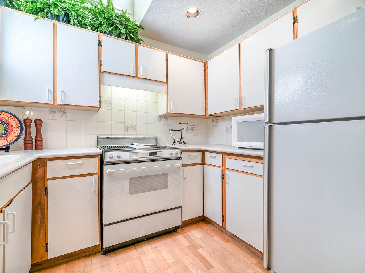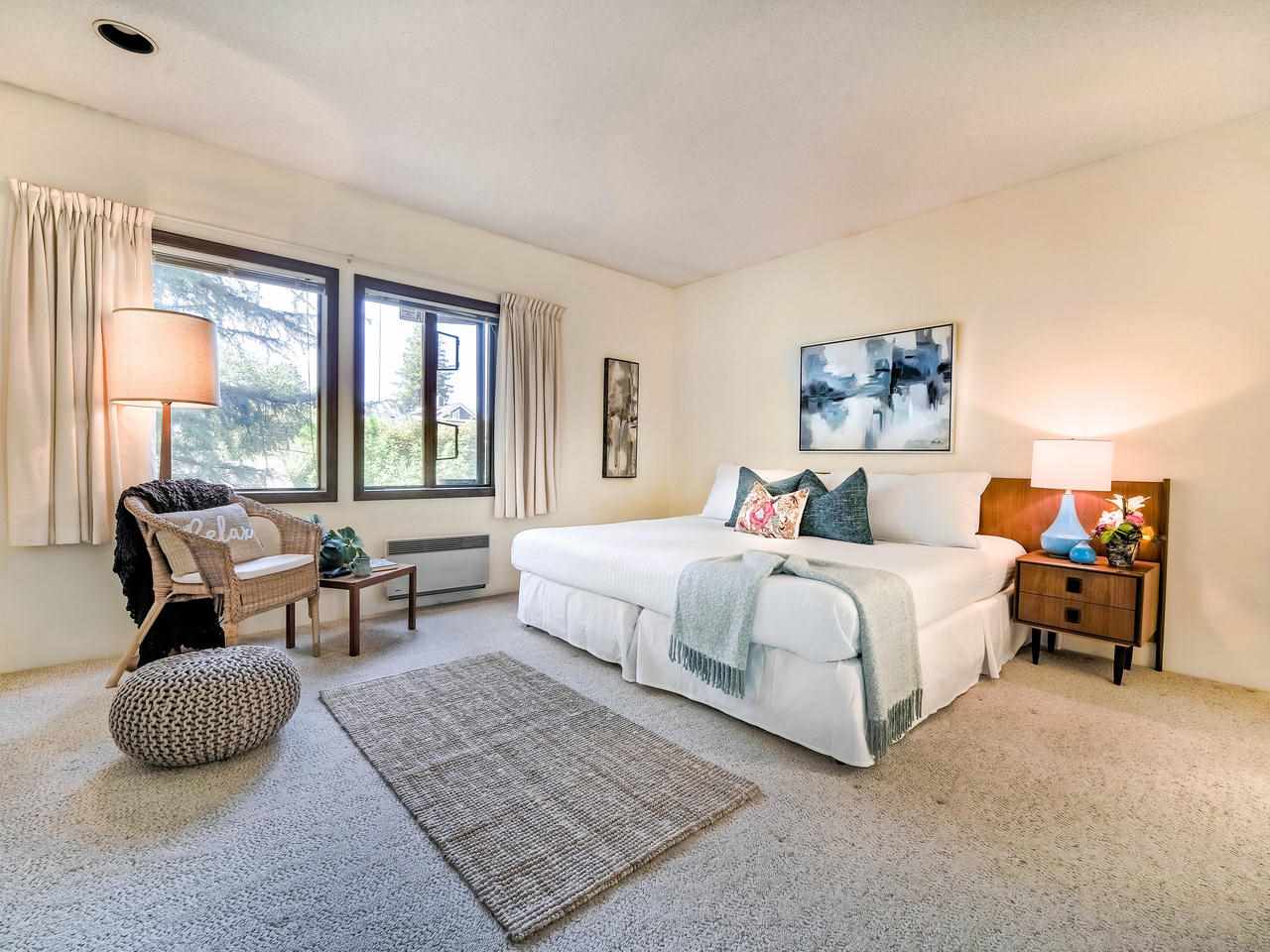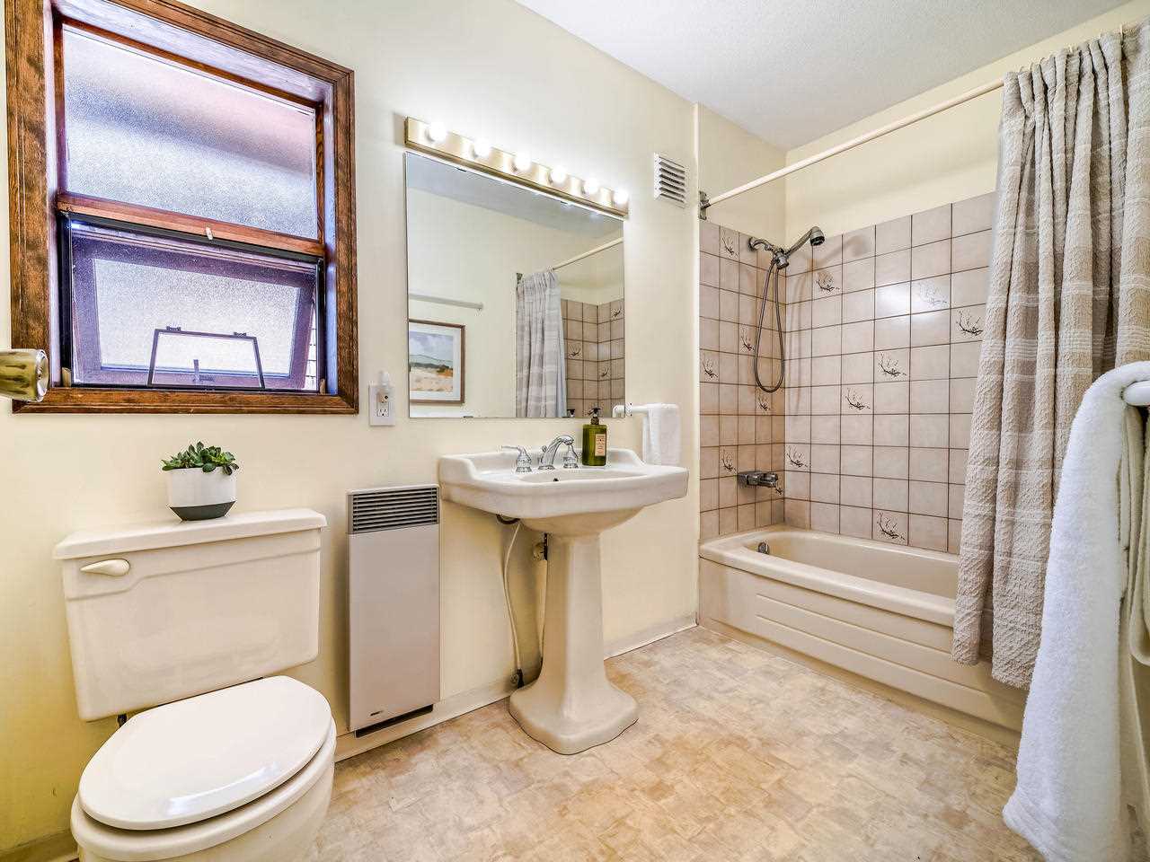 Fantastic Kits location! A wonderful, well cared for, light-filled, home to put your feet up! Stunning living room with high ceilings & wood burning f/p leading out to a gorgeous private, fenced, landscaped patio to have your morning coffee or a glass of wine. Kitchen has high ceilings with skylight & is well appointed. The dining room can easily accommodate entertaining friends and family. Built-in office area & powder room is conveniently on the main floor. Generous "king-size" master bdrm with a wall of closets & cheater ensuite. 2nd bdrm can accommodate a queen bed + 25' x 12'-clean, dry, very USABLE crawl space ! Lots of storage in this home inc. a good-size 1-car garage with more storage! Other prkg. available. No monthly fees! An opportunity!