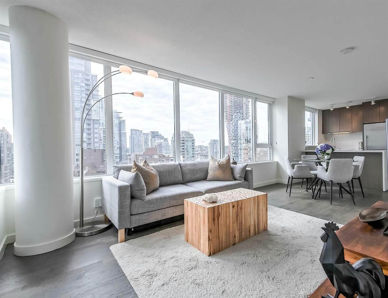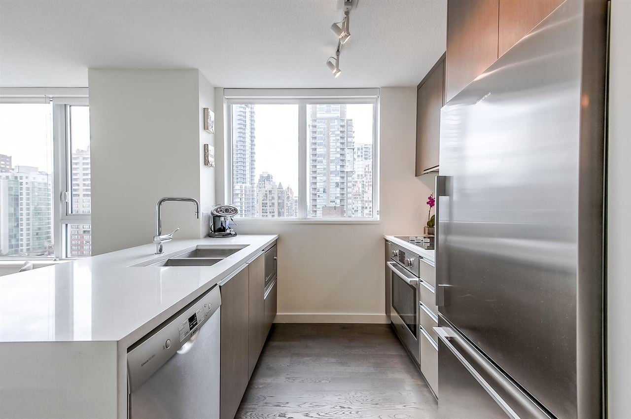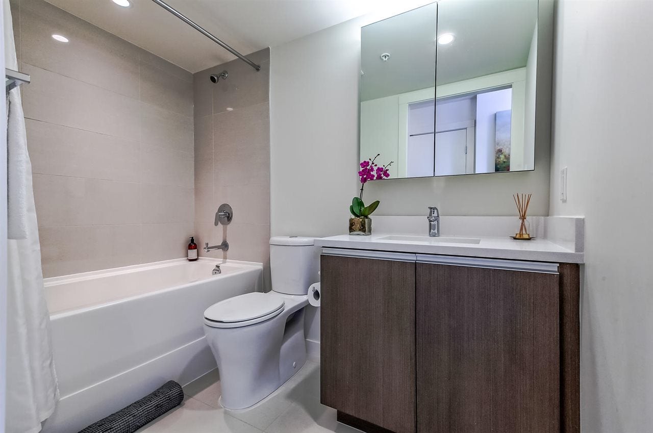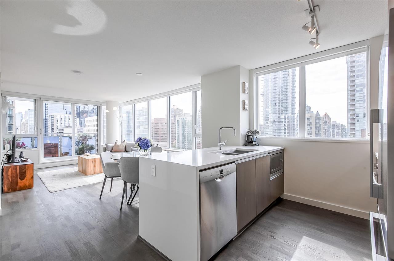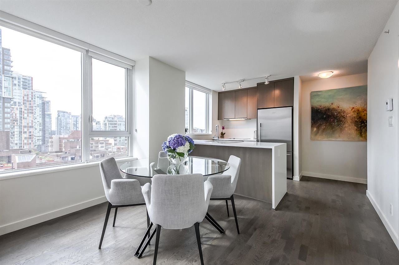 VERY RARE!! MODERN, BRIGHT. "LOVINGLY MAINTAINED" SPACIOUS-CORNER SUITE. This beautifully appointed 1 bed + den + flex space suite is truly unique!! The wonderful floor plan makes gracious living easy while its air conditioning, quality laminate flooring and many windows ensures a bright and comfortable home. The dream kitchen offers a large window, natural stone counter tops, quality stainless steel Bosch and Fisher Paykel appliances and PLENTY OF SPACE. Entertain friends & family in the large open concept living area or enjoy the city and water views, BBQ and a glass of wine on the balcony. Need more space? This suite offers more! The den w/window & a useful flex space offer possibilities++!! Includes 1 pkg & storage locker.